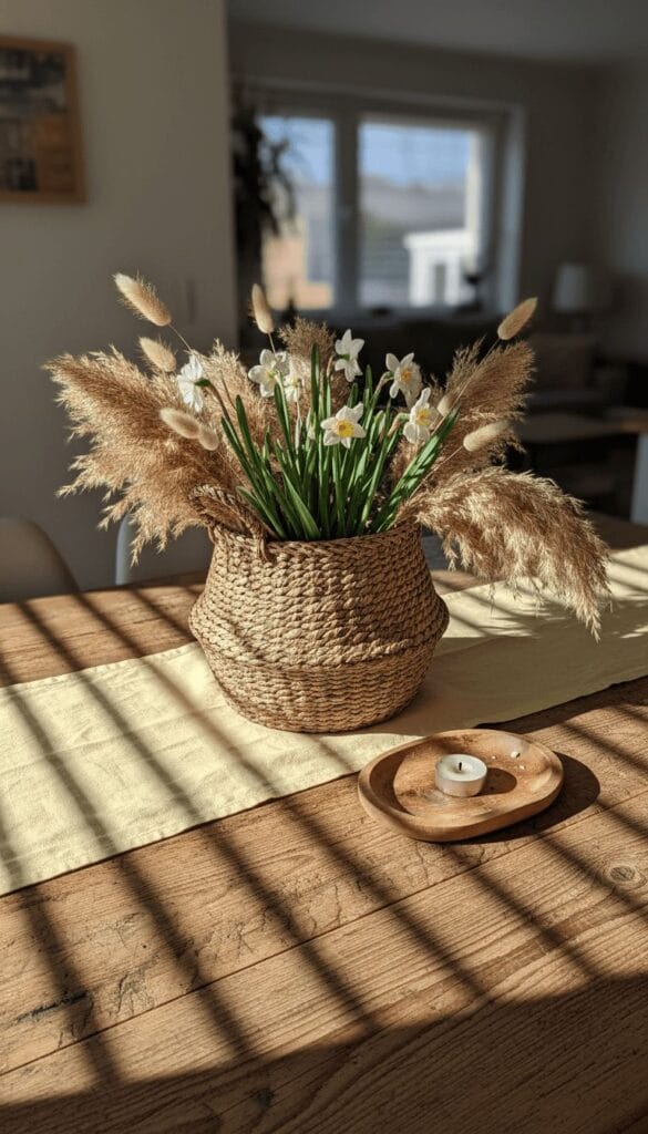 Half dried, half fresh works better than you’d think. Pampas grass or dried bunny tails next to fresh tulips or narcissus creates that contrast people stop scrolling for. A wooden bowl or seagrass basket holds them together visually.