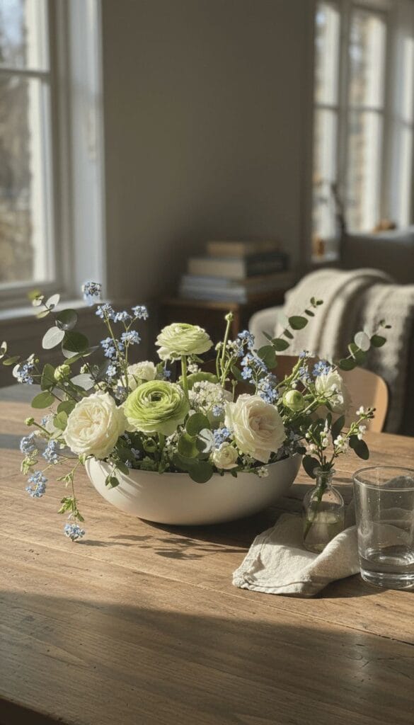 Pastel eggs in a shallow bowl with some greenery tucked around them. Simple and seasonal. A nest made from real twigs with a few sprigs of baby’s breath adds texture without craft-store energy. Keep colors soft — sage, cream, pale blue.
